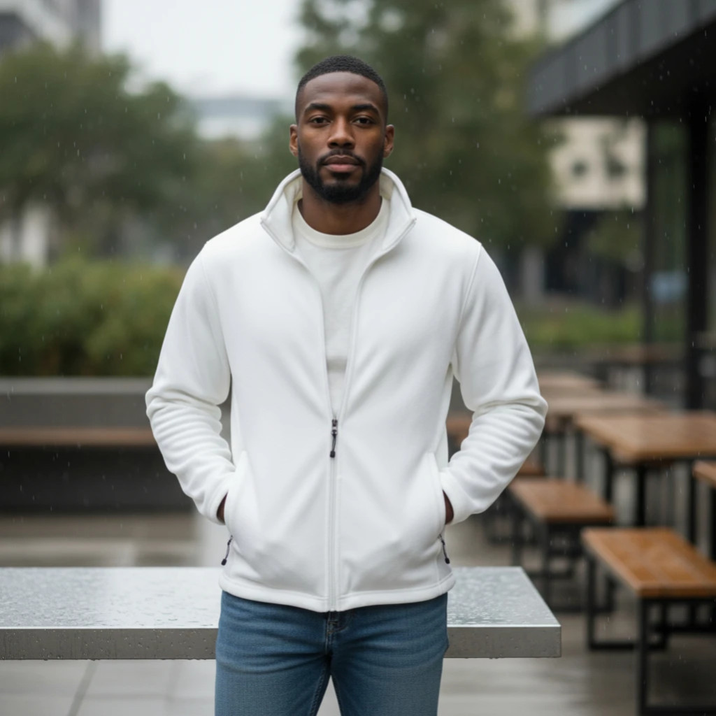 Prémium polár kardigán - fehér élelmiszeripari polár kardigán  - 100% poliészter - cipzáras - két alsó zsebbel - gumírozott mandzsettával - kényelmes viselet - fényviszzaverő csíkkal is elérhető