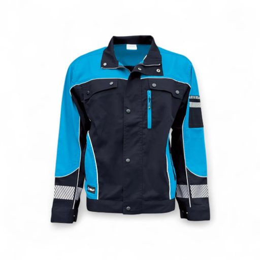 Prémium minőségű munkadzseki - 280grammos kevert szálas alapanyagból - 62% poliészter, 35% pamut, 3% elasztán - két belső mellzseb - bal mellrészen cipzáras, extra belső zseb - bal karján rávarrt ceruzatartó zseb - két cipzáras oldalzseb a derékrész felett - magas minőségű fém cipzár, patentos takarópánt - patentokkal állítható csuklórészek és derékpánt - modern, fényvisszaverő díszítőelemek - antracit szürke - égkék színben.