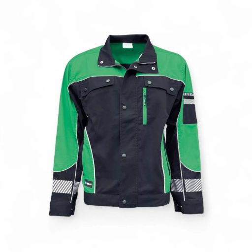 Prémium minőségű munkadzseki - 320 grammos alapanyagból, 97 % pamut/3% elasztán - két belső mellzseb - bal mellrészen cipzáras, extra belső zseb - bal karján rávarrt ceruzatartó zseb - két cipzáras oldalzseb a derékrész felett - magas minőségű fém cipzár, patentos takarópánt - patentokkal állítható csuklórészek és derékpánt - modern, fényvisszaverő díszítőelemek - antracit szürke - zöld színben.