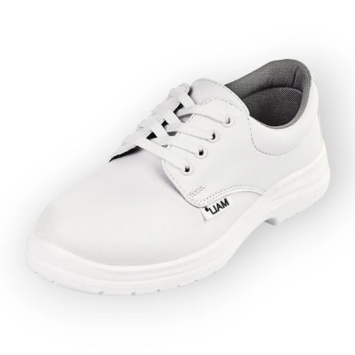 • Orrmerevítő nélküli, fémmentes, thermokaplis változat • fűzős félcipő • folyadékoknak jobban ellenálló, fehér mikroszálas felsőrész • kiváló szellőző, vízgőzáteresztő tulajdonságok • antisztatikus, olajálló, hajlékony, kétrétegű, fehér PU talp, ütődéselnyelő sarokkal • nedves acél és kerámia felületekre bevizsgált, SRC fokú csúszás elleni védelem, kényelmes talpbélés • könnyű súlyú, egészségügyi, élelmiszeripari munkákhoz, egész napos viseletre ajánlott védőlábbeli • szivaccsal párnázott bokarész és békanyelv • 35-től 48-as méretig