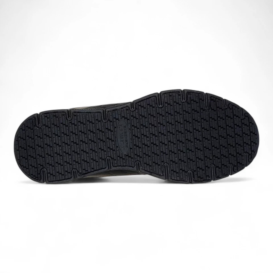 Könnyű és kényelmes munkacipő O1 kategóriában. - Vízlepergető, sima szintetikus felsőrész – könnyen tisztítható. - Csúszásmentes (SRC minősítésű) gumitalp nedves és olajos felületeken is biztos tapadást. nyújt - Skechers Memory Foam® párnázott talpbetét a maximális komfortért. - Ütéscsillapító, hajlékony középtalp a kényelmes járásért. - Puhán párnázott boka- és nyelvrész. - Fémmentes kialakítás – könnyű, rugalmas viselet. - Egyszínű, letisztult fekete dizájn.