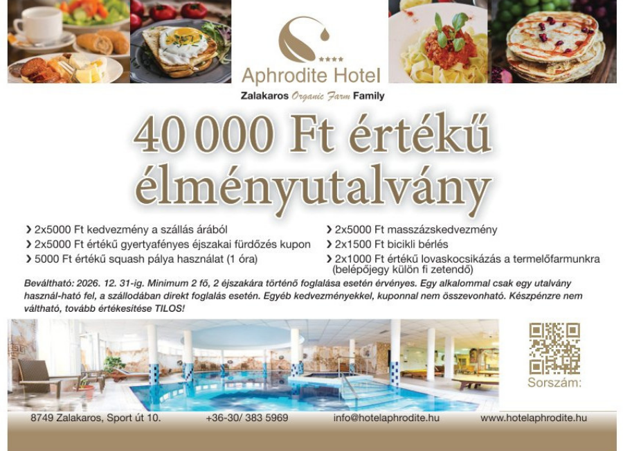 Köszönjük, ha nálunk vásárol, és engedje meg, hogy vásárlása után megajándékozzuk egy 40.000,- Ft értékű ajándékutalvánnyal, amelyet 2026.12.31- ig be tud váltani, ha meglátogatja a Zalakarosi Hotel Aphrodite Wellness szállodát. Bízunk abban, hogy néhány kényeztető napot eltölt majd a hotelben és igénybe tudja venni különleges Önnek szóló ajándékunkat. A kupon érvényesítéséhez elég, ha a sorszámozott kupont bemutatja, akár telefonon is!