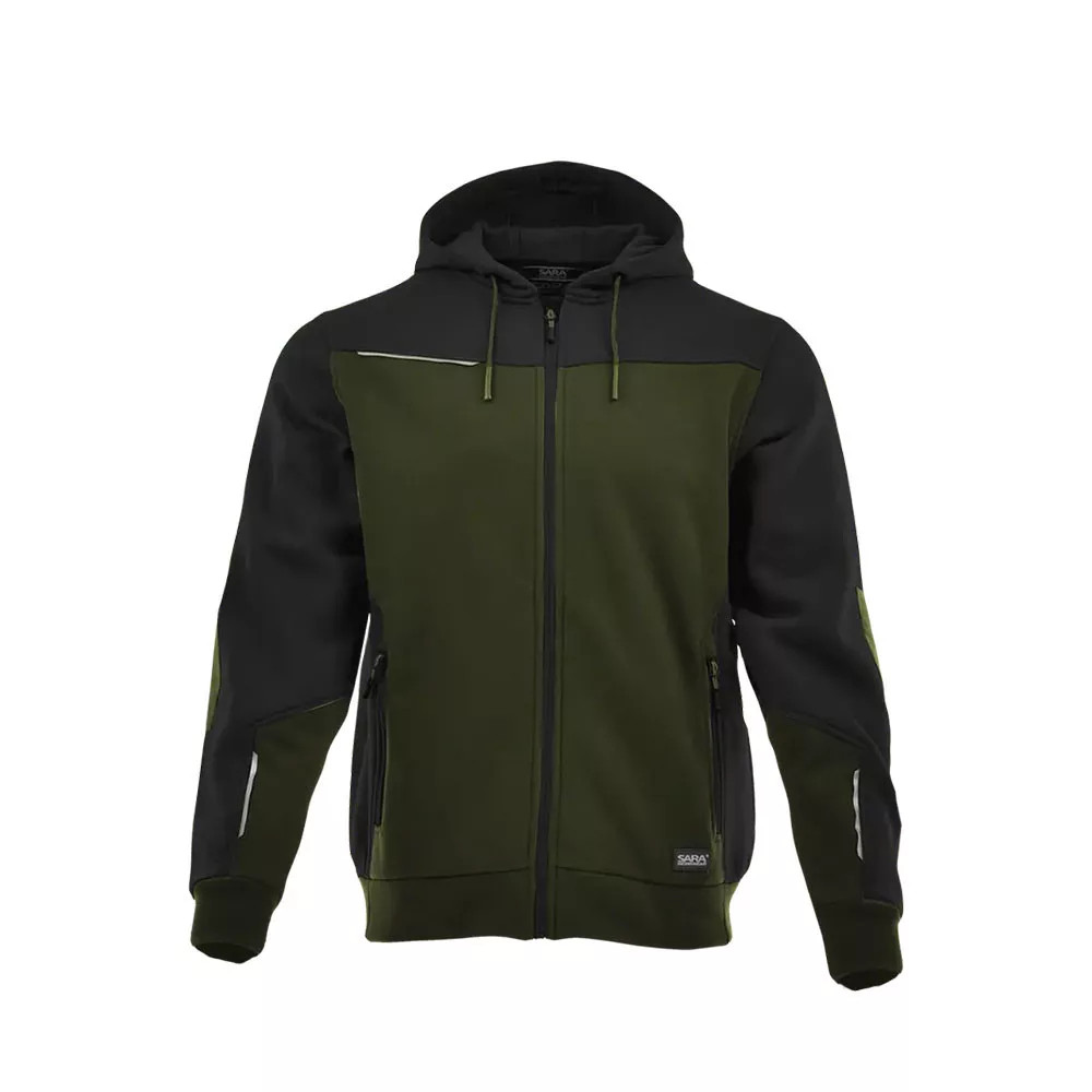 Sara Comfort Plus pulóver kollekció – stílus és funkcionalitás egyben - Kényelmes szabás, cipzáras záródással - Állítható kapucni és rugalmas mandzsetta - Erősített könyökrész és diszkrét fényvisszaverő elemek - Praktikus, cipzáras oldalzsebek - Strapabíró, pamut-poliészter kevertszövet (70% pamut, 30% poliészter) - Szín: olívazöld-fekete - Anyagvastagság: 350 g/m²