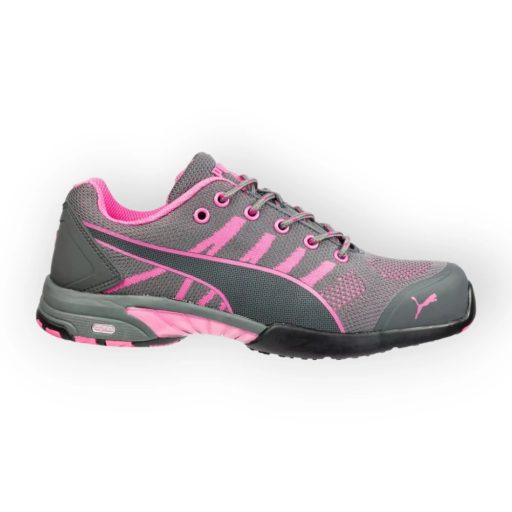 Puma Safety női munkavédelmi cipő. Varrás nélküli Safety Knit textil felsőrésszel készül ultrarugalmas szövetből, acél orrmerevítővel. Párnázott sarokrésszel (IQCELL), mely egy a a cipő sarkába épített gélpárna, hasonlóan működik, akár egy trambulin. Elnyeli az érkező energiát és rugózásnál azonnal visszaadja azt. Megkönnyítvén így viselőjének az egész napi gyaloglást, talpalást. A talpközép részen TPU csavarodásgátló megerősítéssel. Lélegző béléssel és 300°C-ig hőálló, csúszásgátlós gumitalppal. A legmagasabb csúszásmentességi minősítéssel.